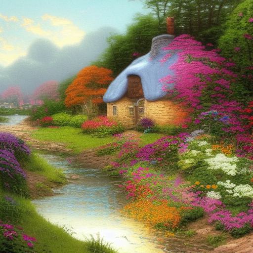Painting of a cottage near a river with many flowers