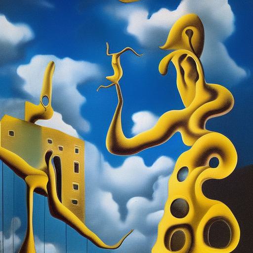 Painting on the side of a building with sculptures and sky