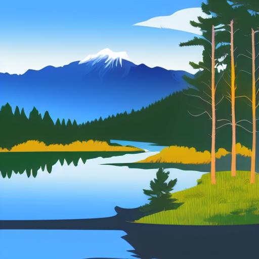The mountain landscape with pine trees and a lake in the foreground