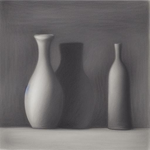 A black and white drawing of two vases and a bottle