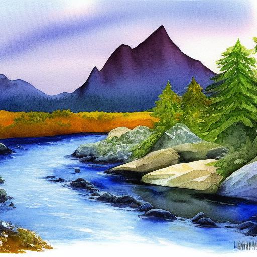 Using a watercolor painting style helps to create a soft and dreamy effect that is well-suited for a landscape scene. Watercolor paintings are known for their delicate, transparent quality, which can help to capture the feeling of a sunset over a river and mountains. The blending of colors in watercolor painting can also add depth and texture to the image, making it more visually appealing.