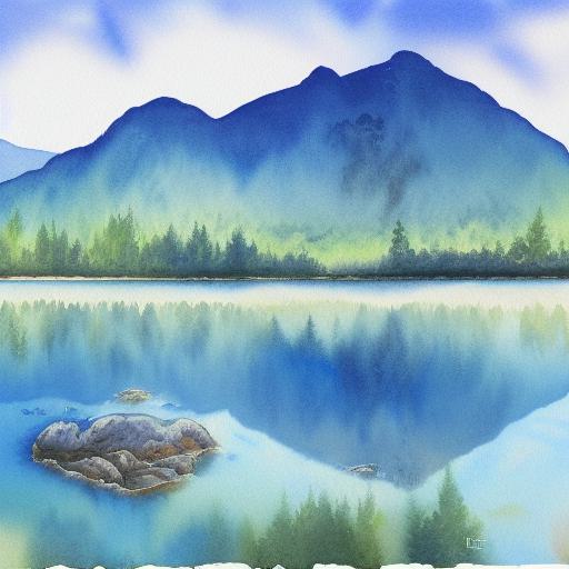 A detailed watercolor painting of a river with a mountain and rocks in the background with birds in the sky