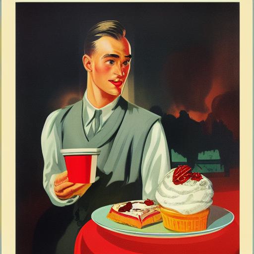 A man holding a cup of ice cream in front of a plate of dessert