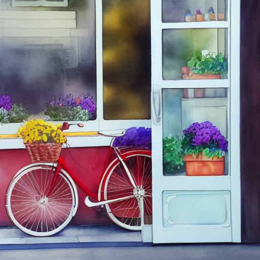 A painting of a bicycle located in front of a flower shop