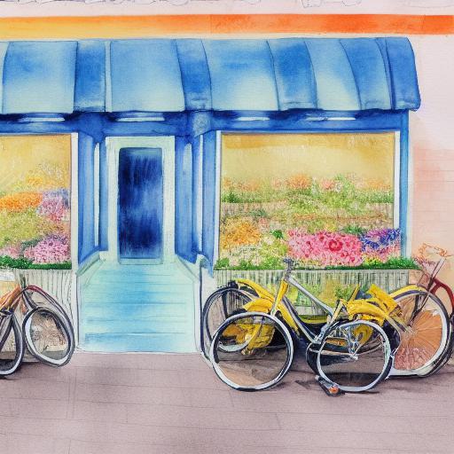 A painting of a bicycle parking in front of a flower shop