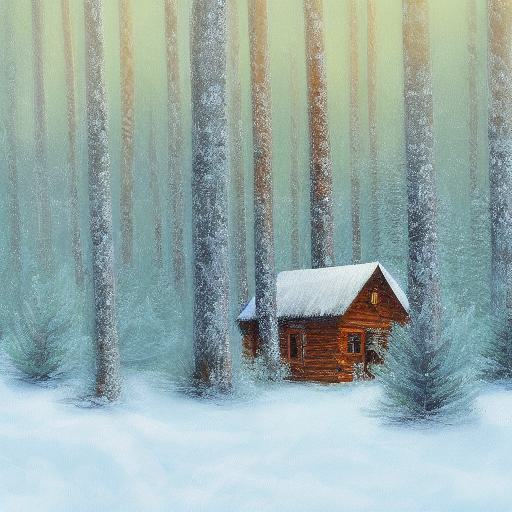 About A painting of a cabin in a snowy forest with trees