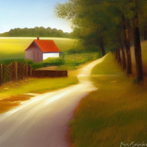 A painting of a country road with a house nearby