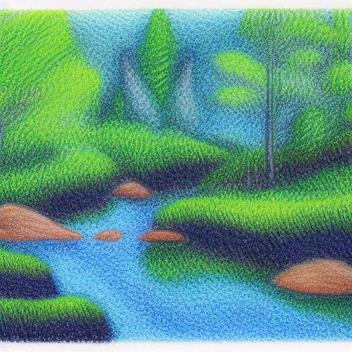 A painting of a forest and river
