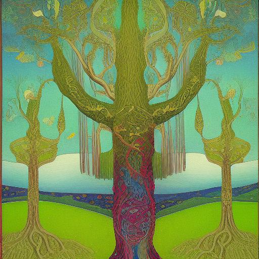 A painting of a green tree with a sky in the background