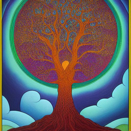 A painting of a tree with a cloudy sky in the background