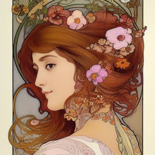 Let’s read the prompt, “a painting of a woman with flowers in her brown hair, an art nouveau painting inspired by Alphonse Mucha, pinterest, art nouveau, alphonse mucha, raphaelite and alphonse mucha“. It can help us to generate a painting of a woman with flowers in her brown hair in the style of Art Nouveau: