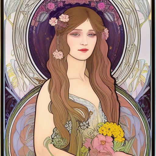 “a painting of a woman with long hair, holding flowers wearing long dresses, painting inspired by Alfonse Mucha, tumblr, art nouveau, alphons mucha, alsphonse mucha, modern art nouveau, elegant, flat, flower, in the garden”