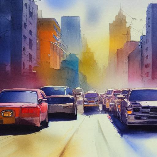A painting of city street with many cars