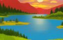 A painting of natural landscape with a lake