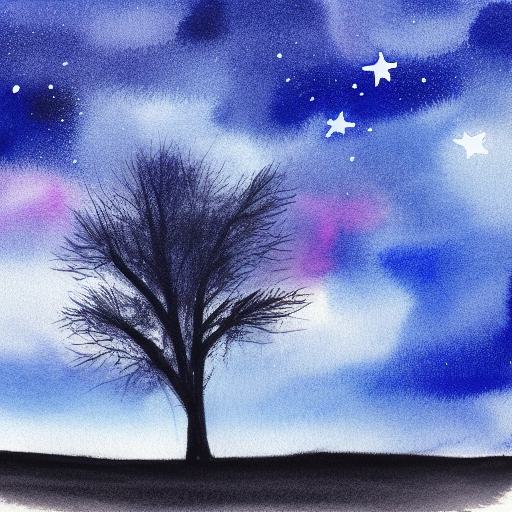 A watercolor of a tree silhouette drawing in the sky at night