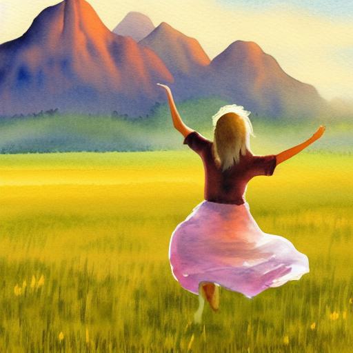 A watercolor painting of a field of wheat and a girl dancing in middle