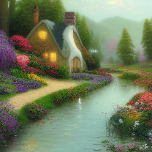 Painting of the cottage by a river with flowers
