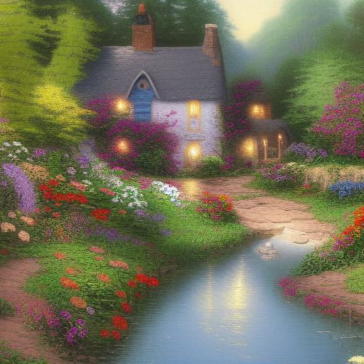 Painting of the cottage by a river with flowers
