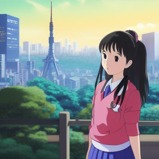 • This stunning anime portrait from Studio Ghibli captures a school girl in front of the vibrant Tokyo cityscape in an ultra wide-angle shot. The school girl stands tall in the center
